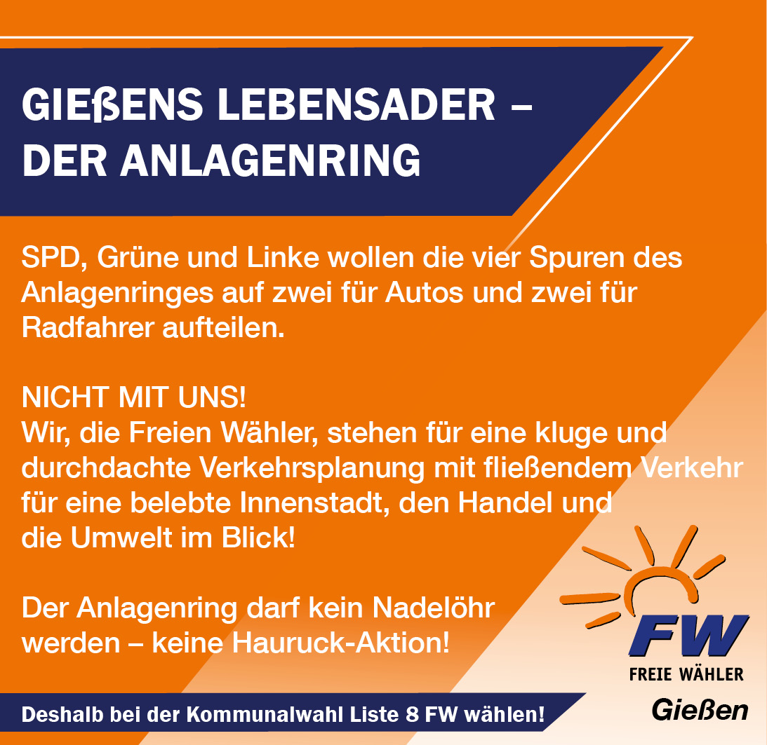 Mit der rein an Sachfragen orientierten ideologiefreien Kommunalpolitik zum Nutzen aller Gießener Bürgerinnen und Bürger werden die Freien Wähler Ihre Vorhaben gemäß dem erarbeiteten WAHLAUSSAGEN 2021–2026 in der Stadtverordnetenversammlung der Stadt Gießen einbringen.
